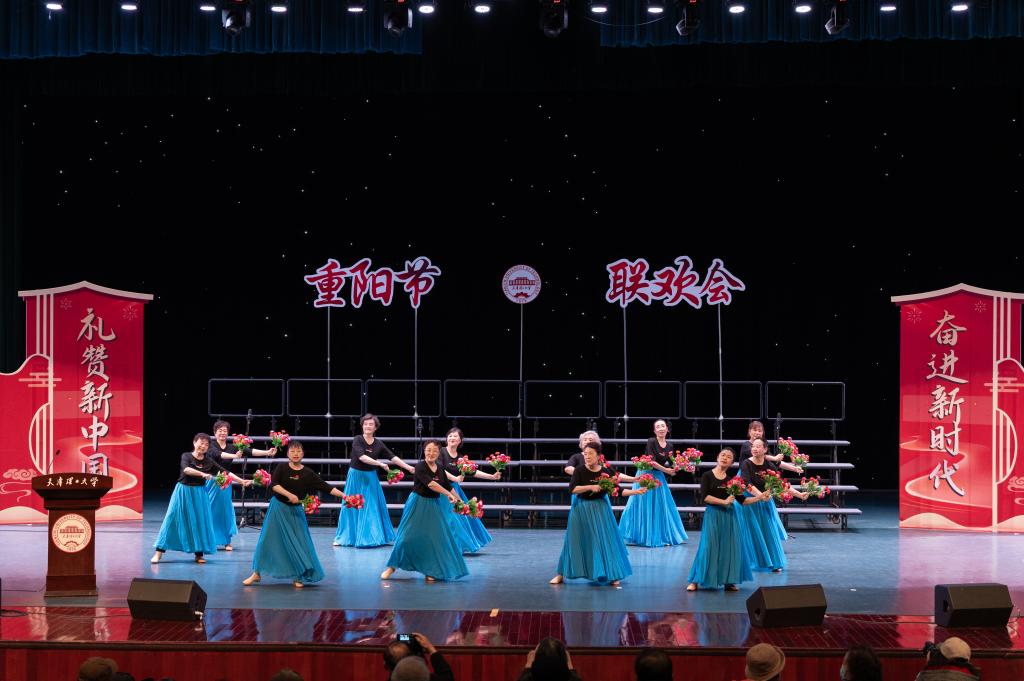 联欢会上,离退休老同志精心准备的节目精彩纷呈,演员和观众情绪高涨。舞台上有走下讲台的老教授,有走出实验室的老专家,有离开工作岗位的老领导和各级管理人员,大家通过在学校各社团的活动又恢复了青春,获得了健康。大合唱、小合唱、独唱、诗朗诵、太极功夫扇、风采展示、舞蹈等节目竞相展示,我校“津今有乐”相声社的学生也表演了精彩的快板书,尽显全校师生对中华民族敬老爱老优良传统的美好传承。舞台下也时时爆发出阵阵喝彩和掌声,观众们纷纷举起手机、相机记录下这美好时刻。